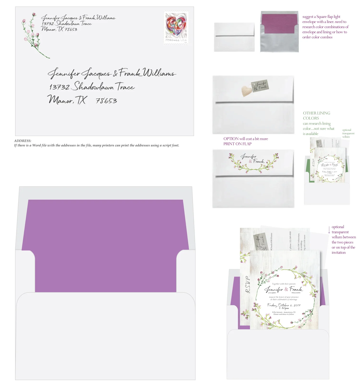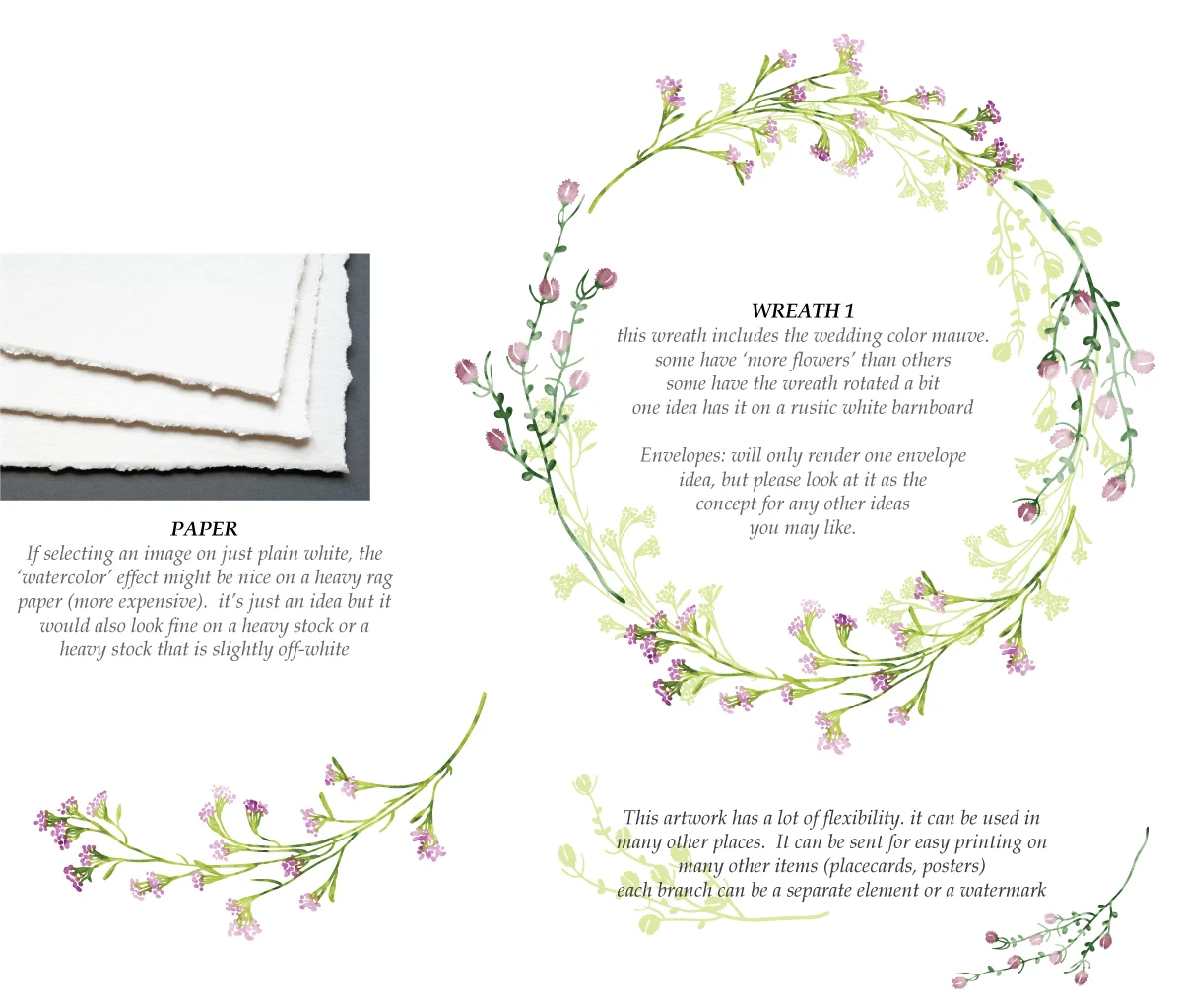 Wreath #1 has four thumbnails, using more or less flowers on the outside and one on rustic white barn board. One RSVP card idea so far. The ENVELOPE concept was worked out using Wreath #1. But if you like any other idea, will apply to an envelope idea.